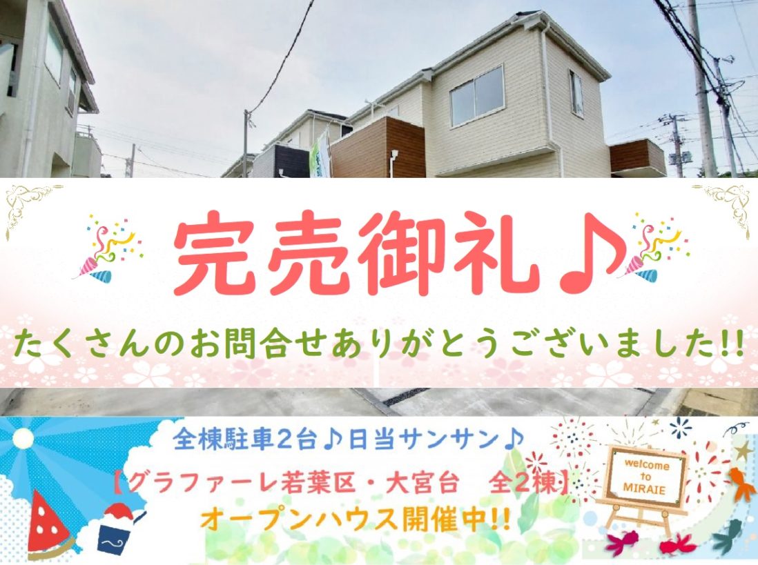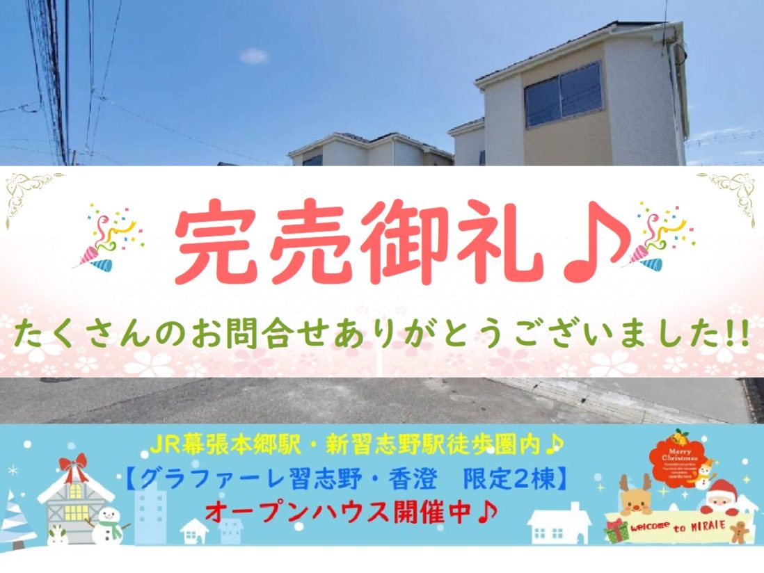 おかげ様で完売しました(*^-^*)これまでたくさんのご来場ありがとうございました(*‘∀‘)9/21付全棟大幅価格変更!!最終1棟です!!【新築価格3,390万円税込】JR新習志野駅・幕張本郷駅徒歩圏内♪全棟駐車2台・…更新日 2020.10.1新築戸建オープンハウス